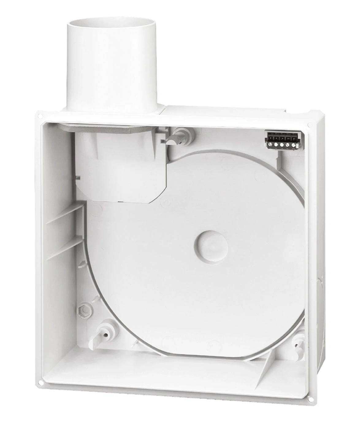 Helios Gehäuse ELS-GU 8111ohne Brandschutz, Unterputz. ELS-GU, Unterputzgehäuse universal, ohne Brandschutz. Unterputzgehäuse ohne Brandschutz, mit luftdichter Rückschlagklappe. Ausblasstutzen seitlich, nach oben (Lieferweise), links oder rechts drehbar. Mittels Zubehör-Set (-ARS, Best.-Nr. 8185) umsteckbar für rückseitigen Luftaustritt in beliebiger Position. Steckverbindung für elektrischen Anschluss herausnehmbar. Aus Kunststoff in Brandklasse B 2. Wieder einsetzbarer Klapp-Putzdeckel. Anschluss DN 80 mm. Zur Lüftung von Bad oder WC, mittels Zubehör-Set auch für Zweiraumlüftung von Bad und WC. UP-Einbau in Wand, Decke oder Installationsschächte. Anschluss von 1 oder 2 Geräten an gemeinsame Hauptleitung bis zu 20 Geschossen. Brandschutz durch Einsatz von Deckenschotts herstellbar.